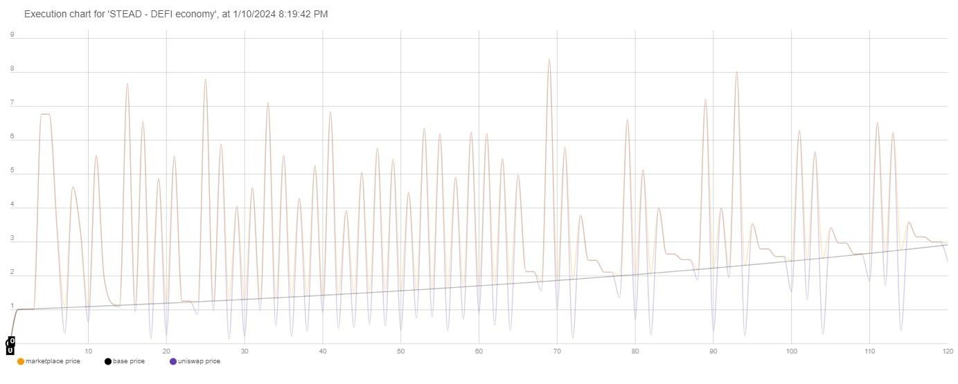 Above: Stead tokenomics simulated over a 120 month period, where the Base Price, which limits token minting, can be seen pushing the real price up whenever it crosses below. Note that the Base Price rises over time.